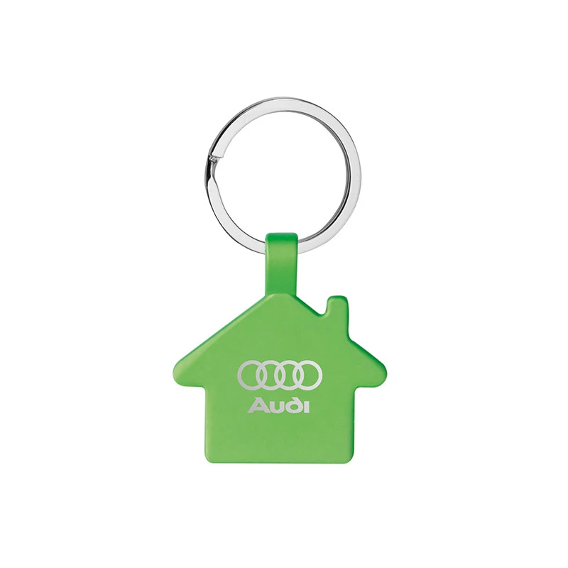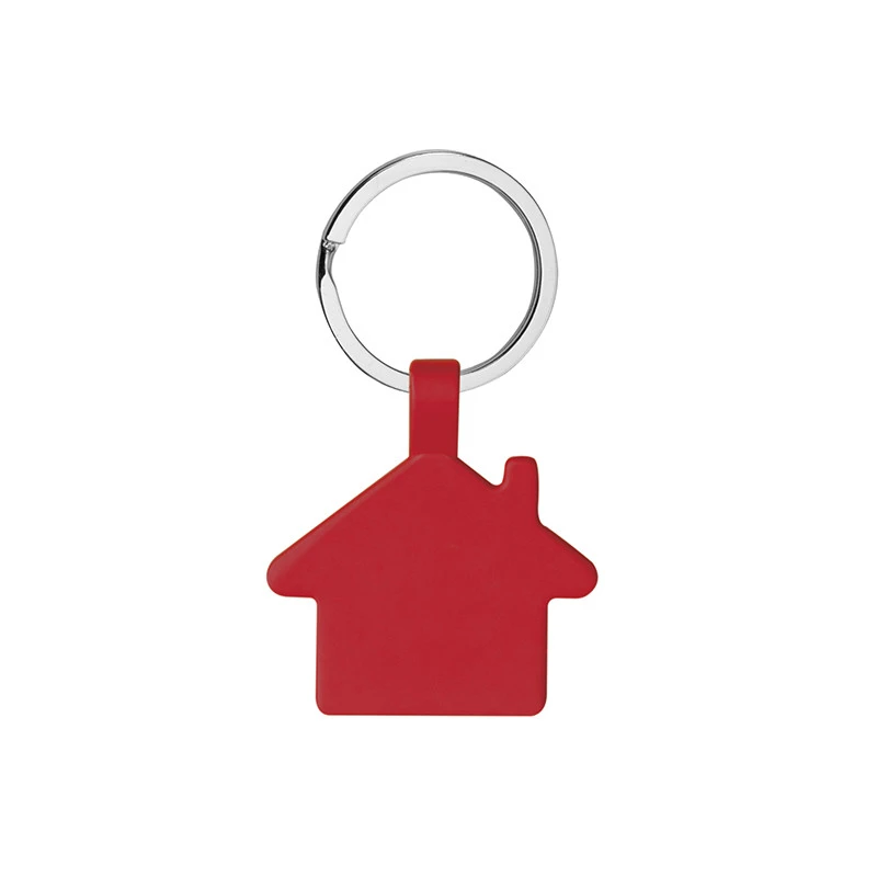 Portachiavi a forma di casa in alluminio verniciato, con anello in metallo, personalizzabile tramite incisione di un testo, logo o sequenza di numeri