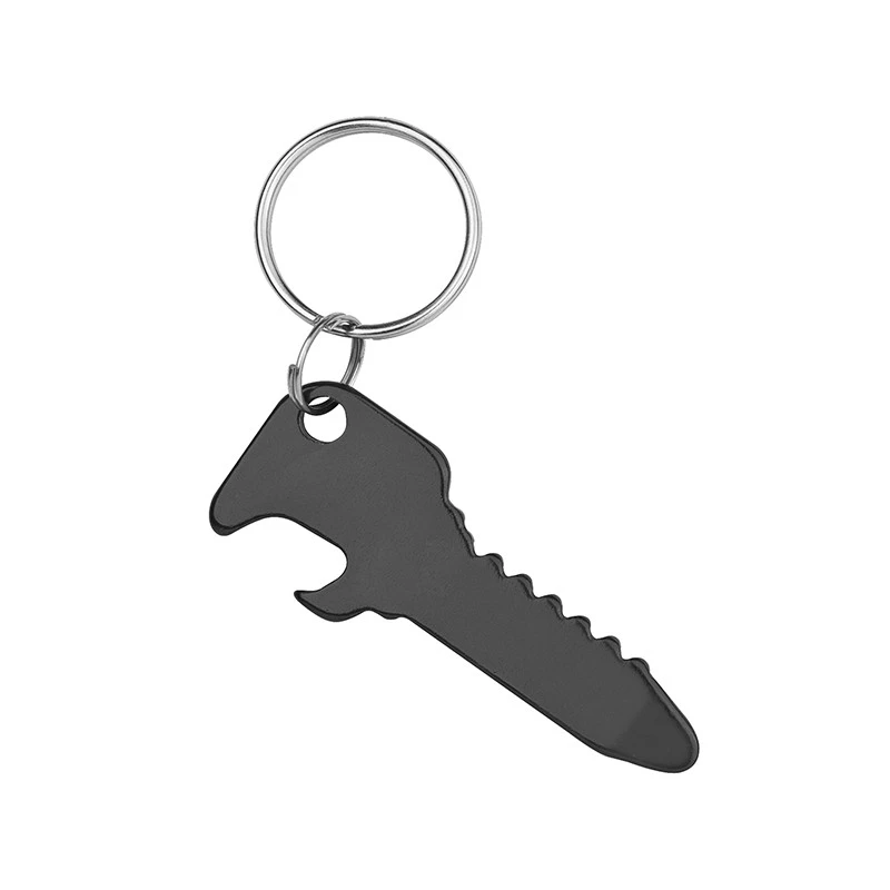 Portachiavi a forma di chiave in alluminio colorato con anello in metallo, personalizzabile tramite incisione di un testo, logo o sequenza di numeri. Utilizzabile anche come cavatappi
