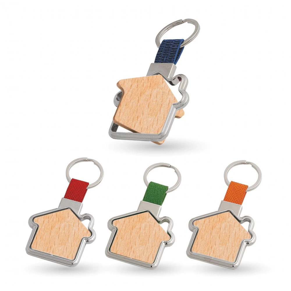 Portachiavi in legno e metallo girevole a forma di casa, finito con cordino in poliesetere e anello in metallo, personalizzabile tramite incisione o stampa UV di un testo, logo o sequenza di numeri