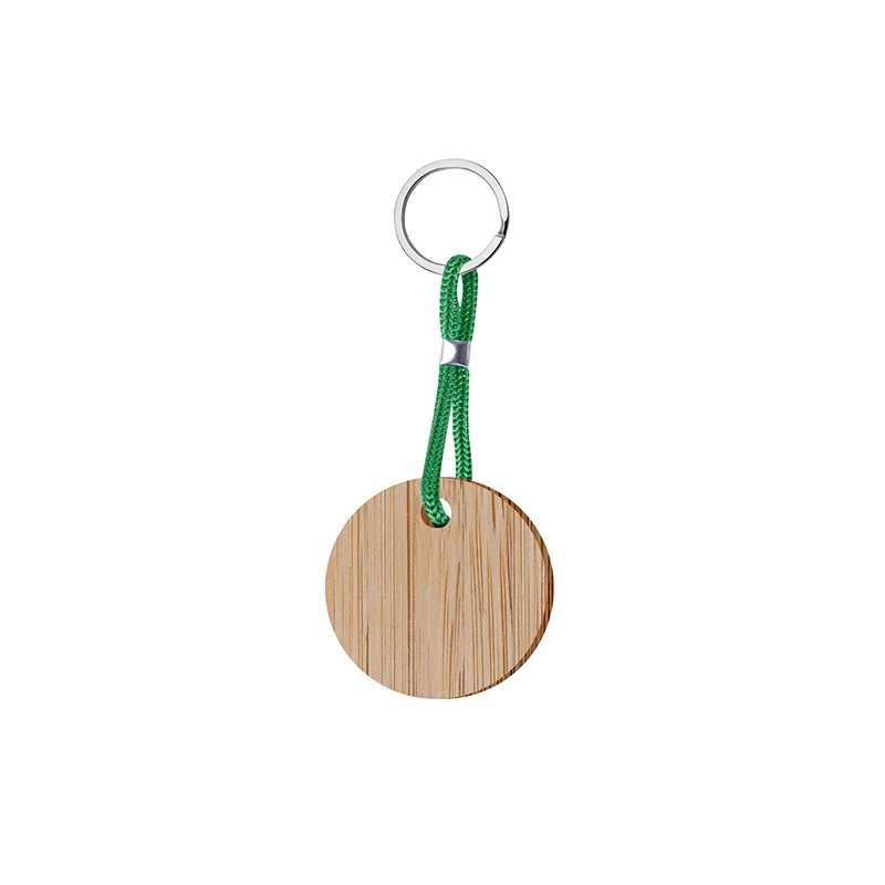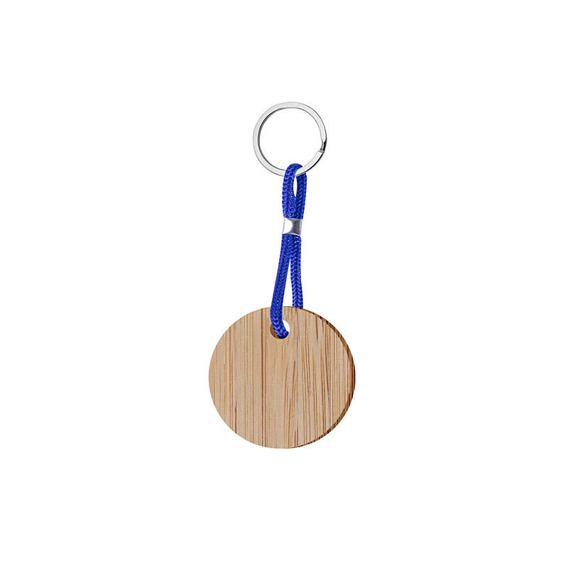 Portachiavi a forma di cerchio in legno, finito con cordino in poliestere colorato e anello in metallo, personalizzabile tramite incisione o stampa UV con un testo, logo o sequenza di numeri