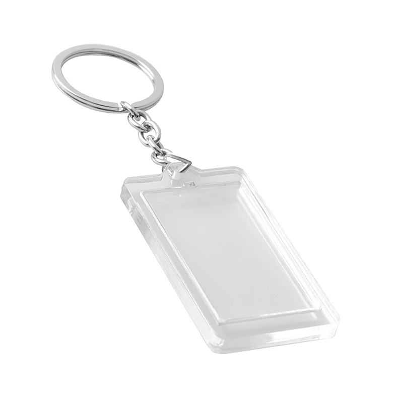 Portachiavi in plexiglass trasparente di forma rettangolare finito con anello in metallo personalizzabile tramite stampa di una foto