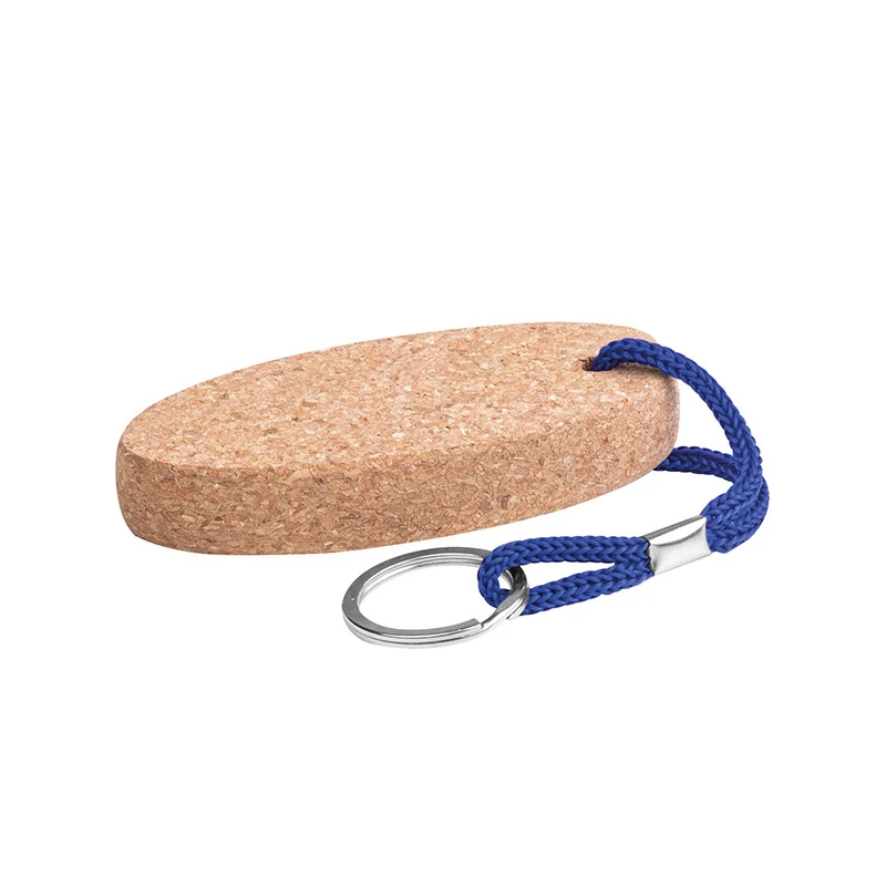Portachiavi in sughero di forma ovale finito con cordino in poliestere e anello in metallo, personalizzabile tramite incisione o stampa UV su uno o entrambi i lati con un testo, logo o sequenza di numeri