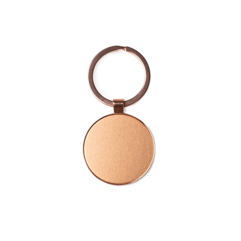 Portachiavi in metallo rivestito in rame di forma rotonda finito con anello in metallo, personalizzabile tramite incisione di un testo, logo o sequenza di numeri